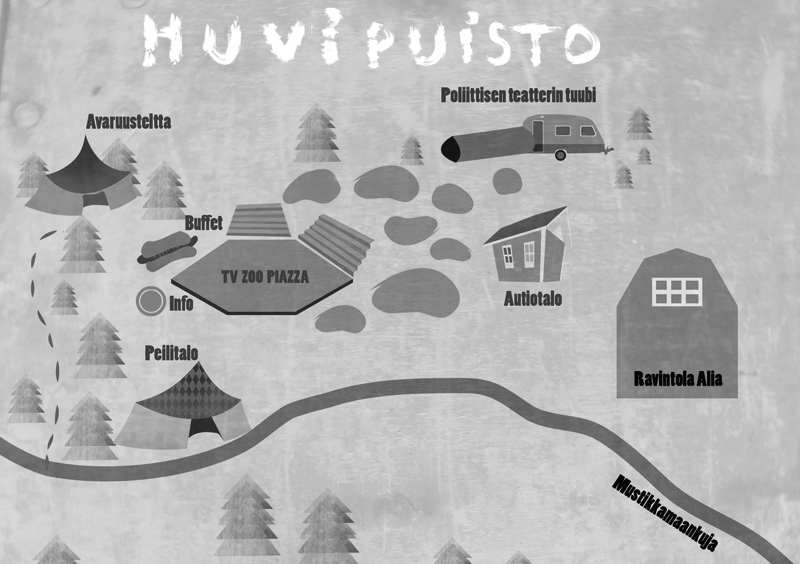 Huvit ovat jakaantuneet neljään eri pääestradiin: Autiotaloon, Avaruustelttaan, Peilitaloon sekä Poliittisen teatterin tuubiin.